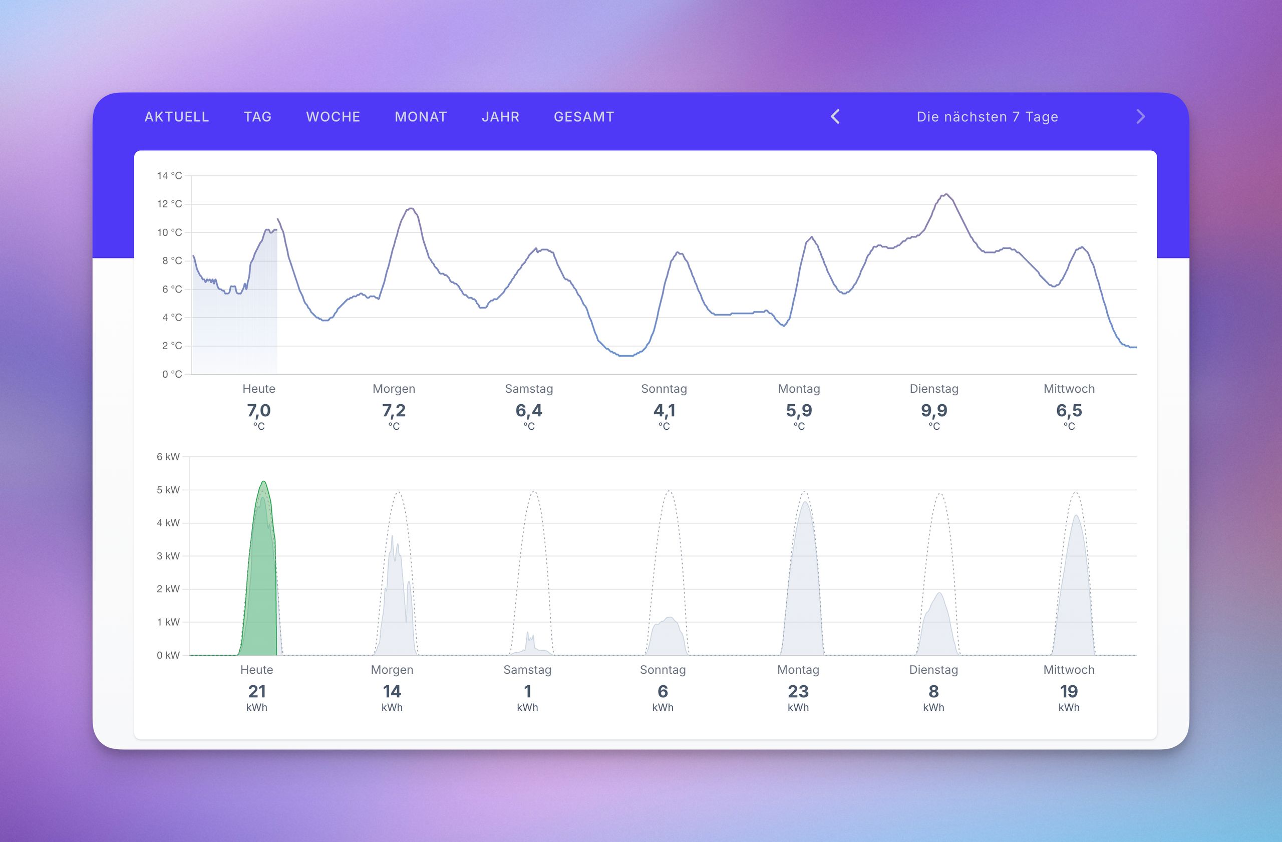 Die Prognose zeigt jetzt bis zu eine Woche im Voraus – auf einer eigenen Seite, mit Clear-Sky-Kurve und Temperatur. Praktisch für die Planung.