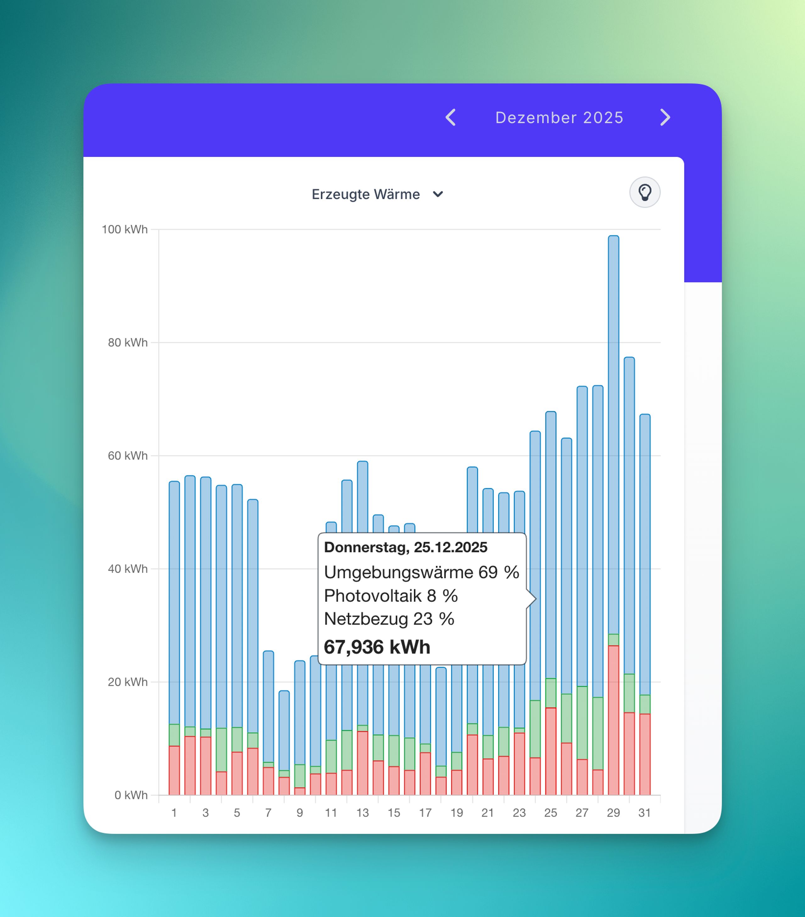 Die Darstellung zeigt, woher die Wärme kommt: Strom aus dem Netz, Strom aus PV und – idealerweise der mit Abstand größte Anteil – aus der Umgebung.