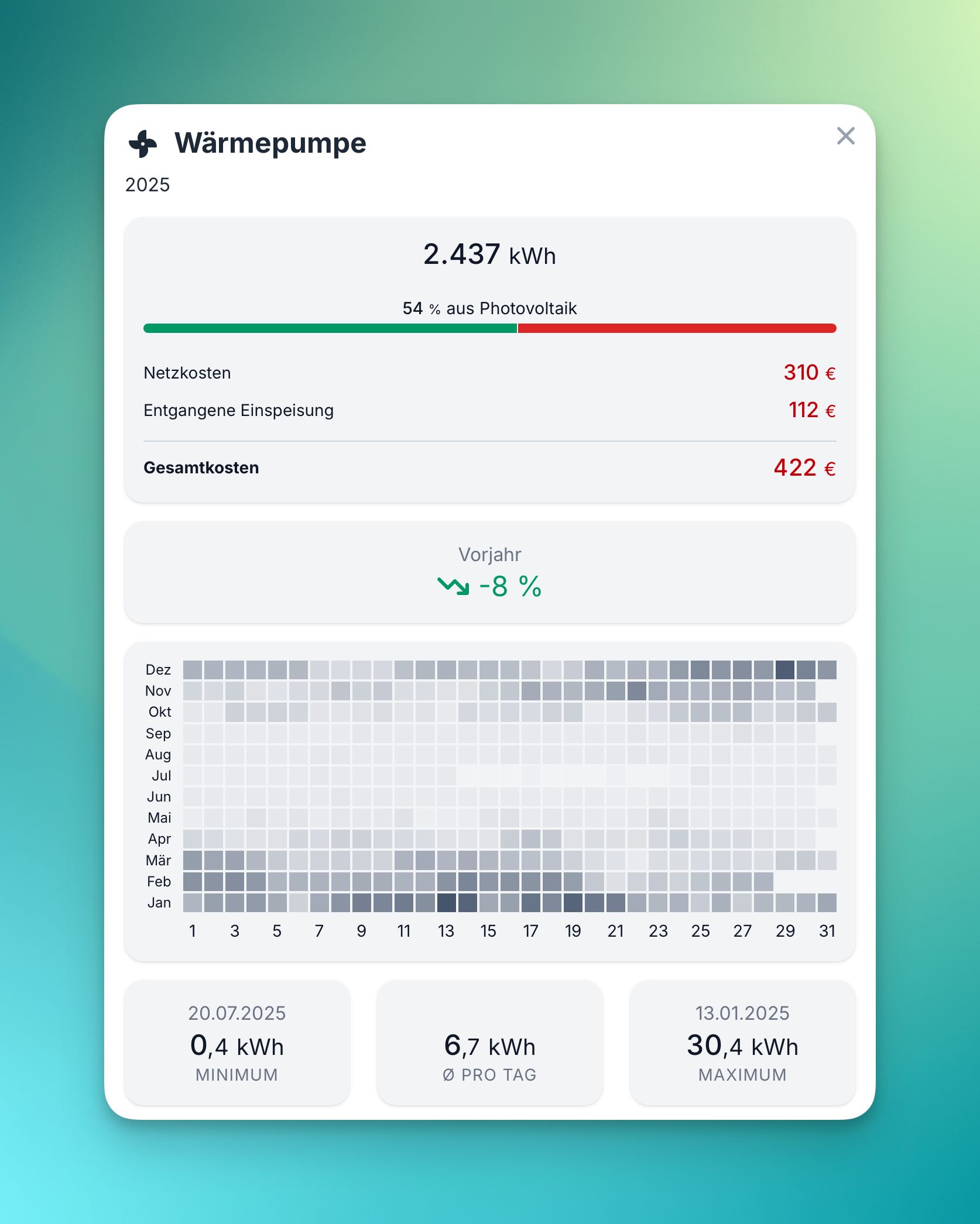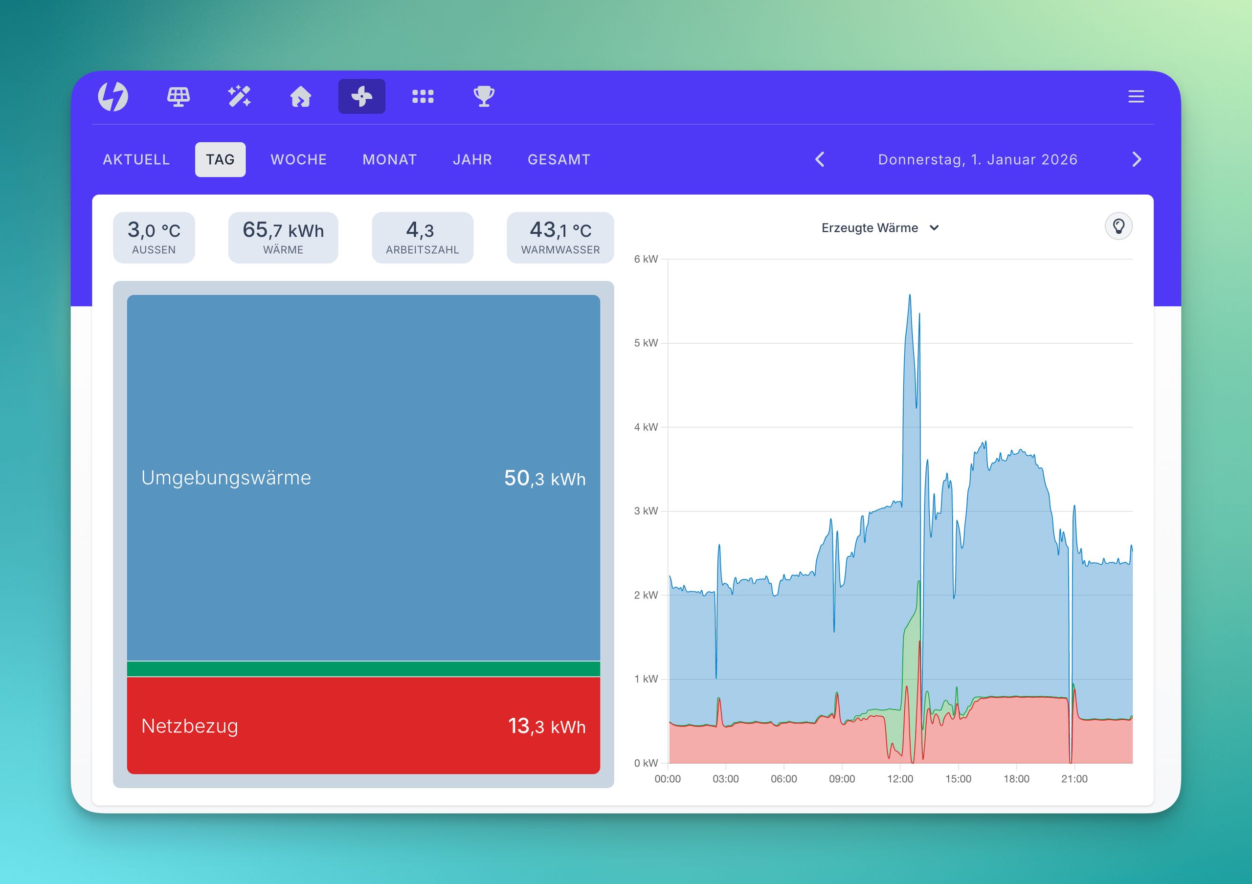 Du hast eine Wärmepumpe und deren Messwerte über Home Assistant oder ähnliches verfügbar? Dann wird dir die neue Seite gefallen. Erzeugte Wärme, Wasserspeicher- und Außentemperatur – alles auf einen Blick, parallel zu Strombilanz und Hausverbrauch.