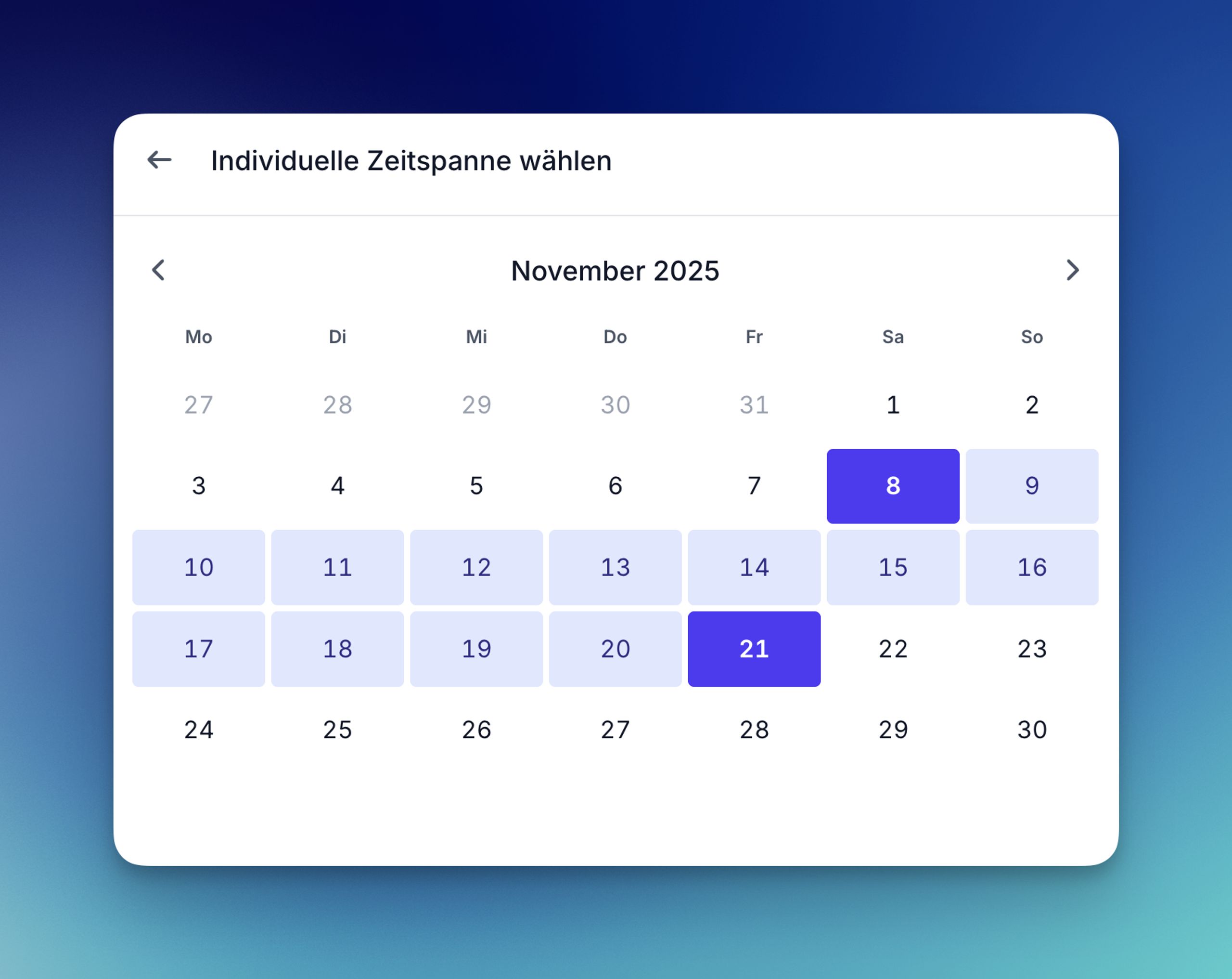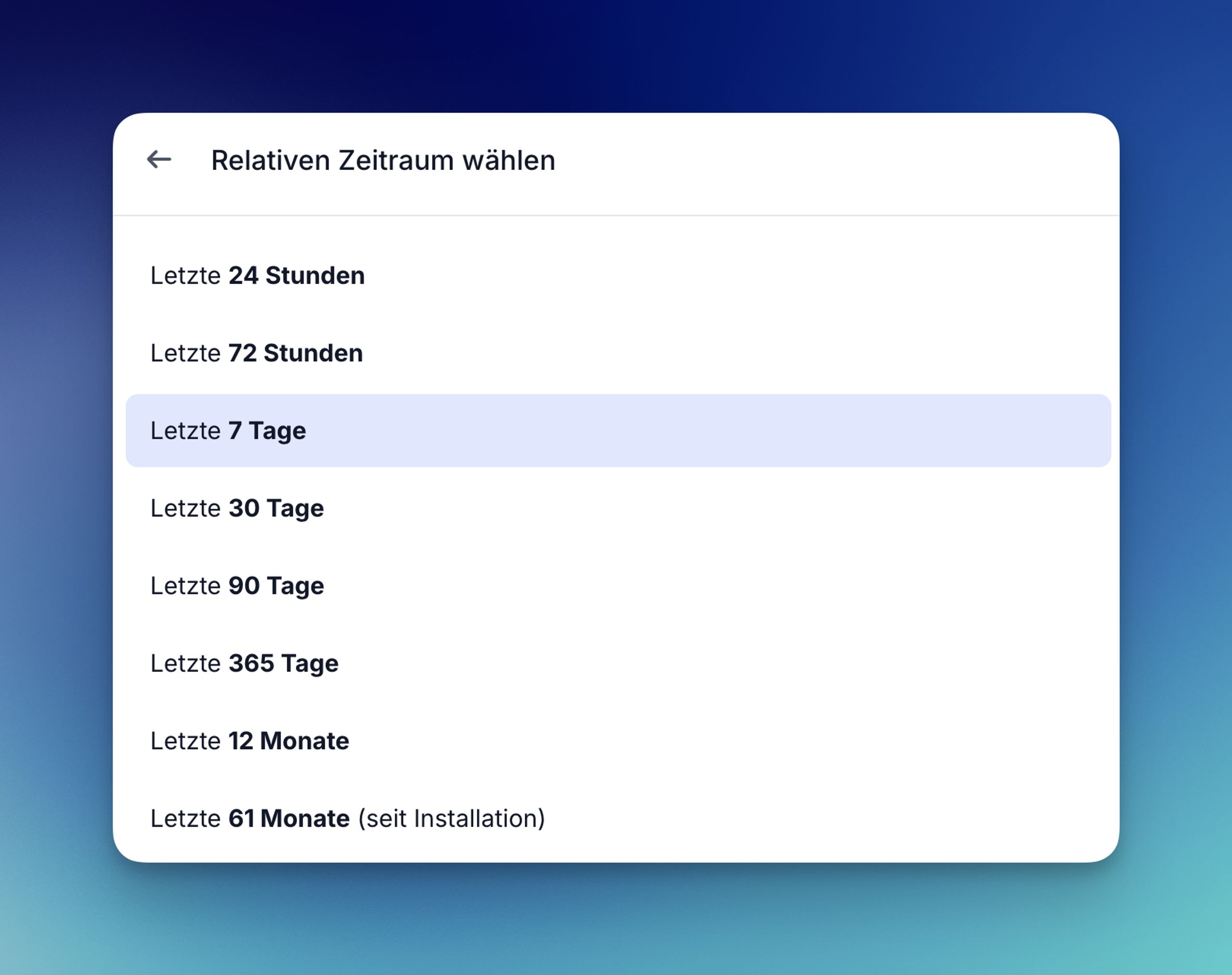 Das wurde oft gewünscht: freie Zeitraumauswahl, überall. „Letzte 30 Tage”, „Letzte 12 Monate” – oder einfach per Kalender einen beliebigen Zeitraum festlegen. Geht jetzt.