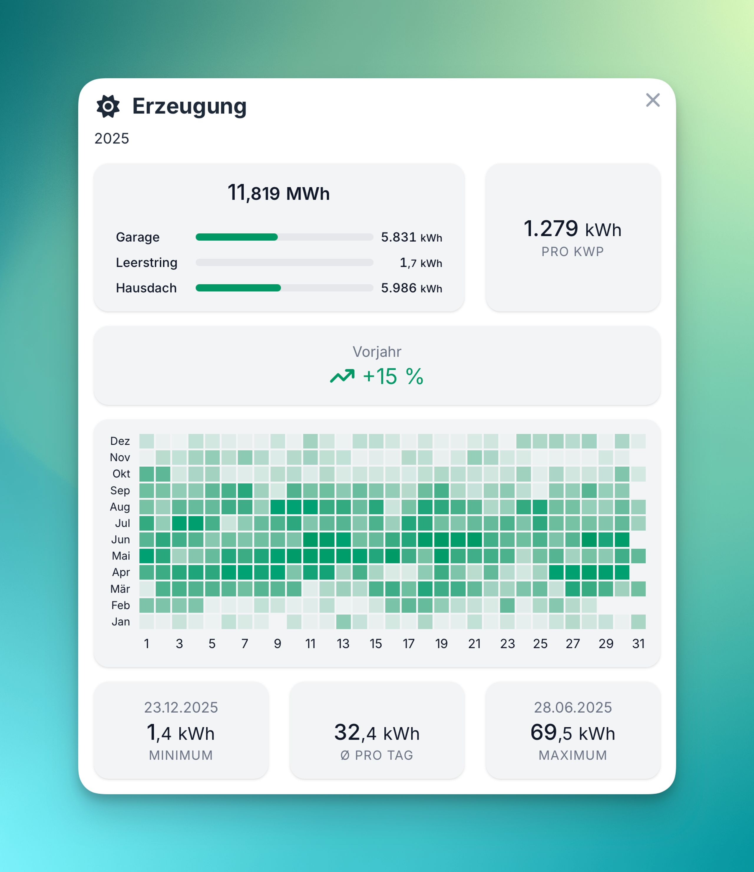 - Spezifischer Ertrag (kWh/kWp) zum Anlagenvergleich
