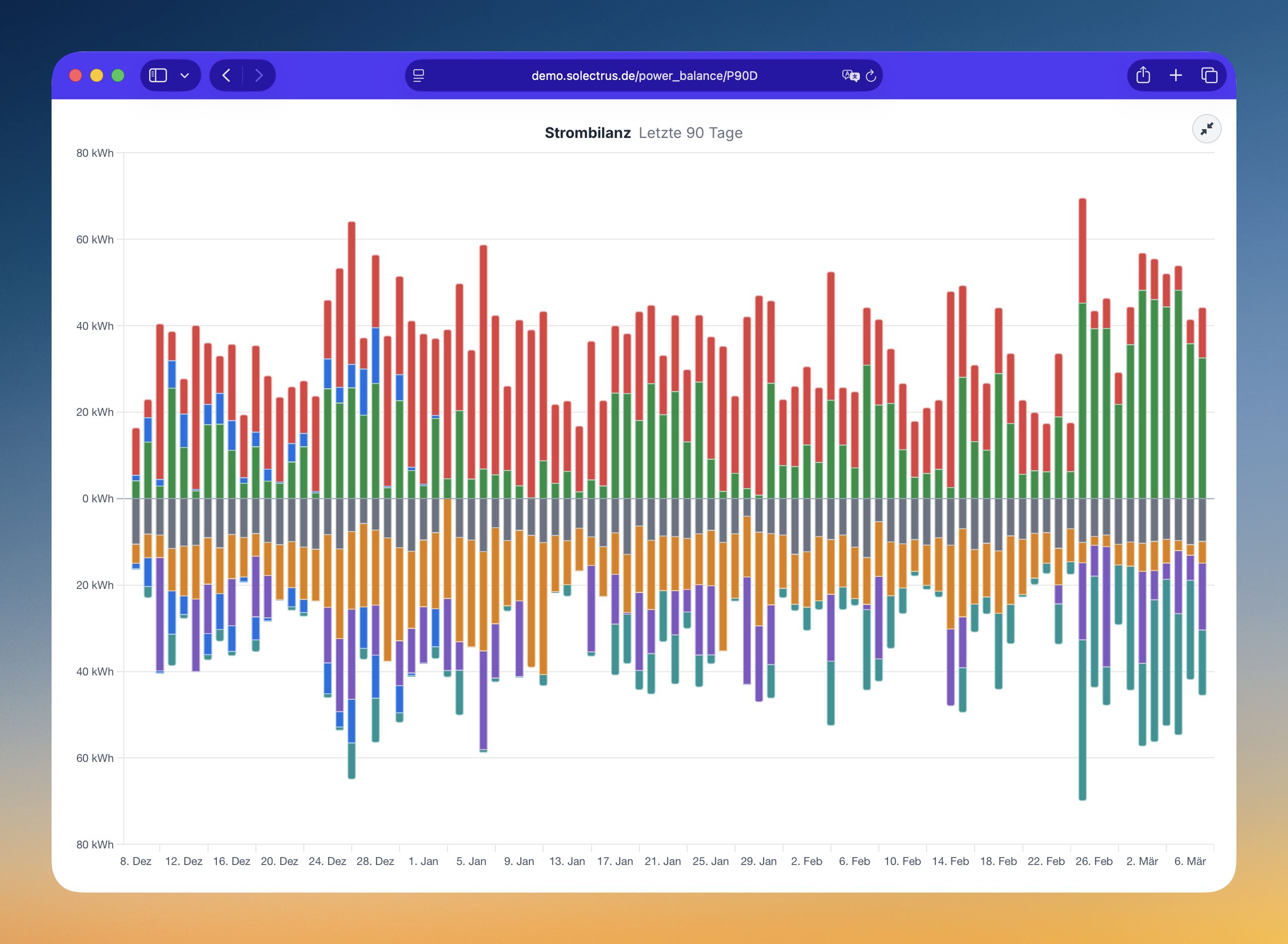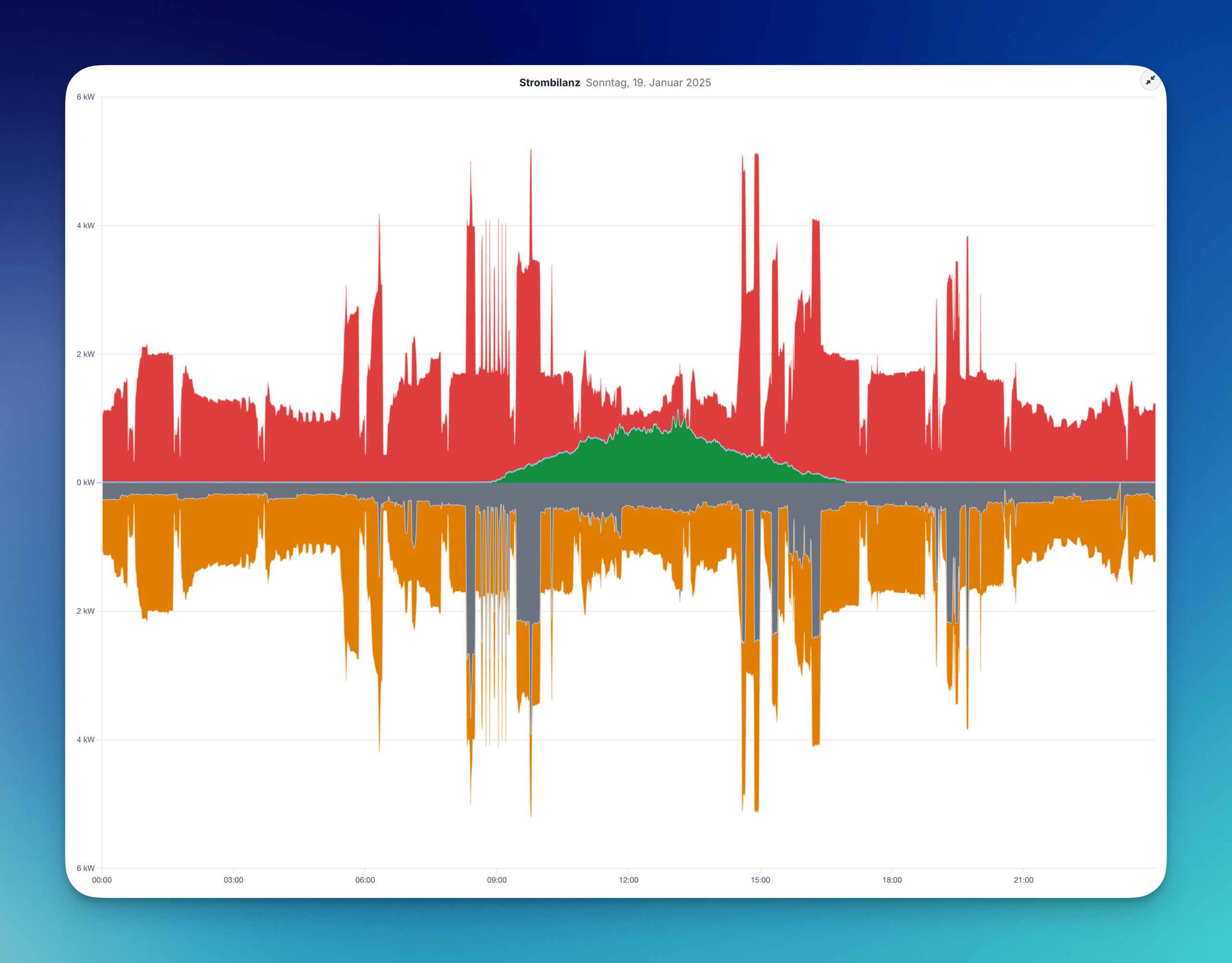 Die Lösung: Die bereits bekannte Strombilanz wird jetzt über den Tagesverlauf als Diagramm dargestellt. Man sieht sofort, woher der Strom kommt und wofür er draufgeht - nicht nur als Summe, sondern in jedem Moment des Tages.