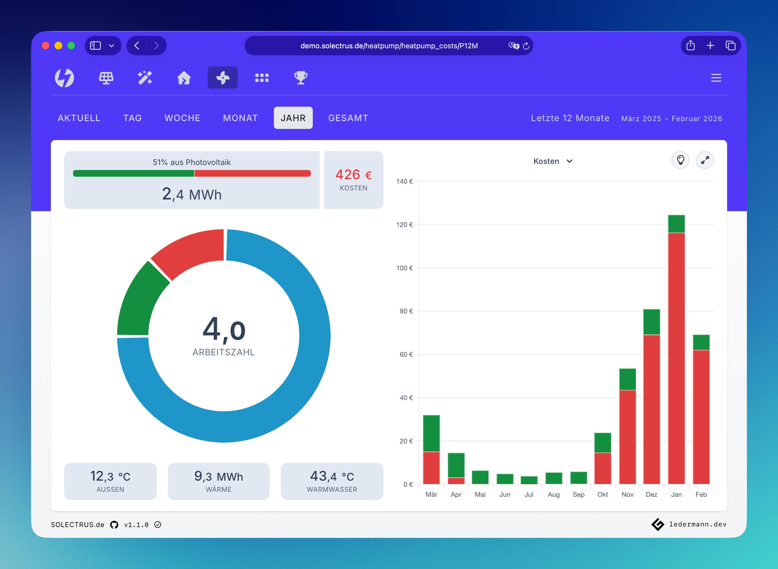 Arbeitszahl als Ringdiagramm: Die Zusammensetzung der erzeugten Wärme aus PV-Strom, Netzstrom und dem (meist größten) Anteil der Umgebungswärme wird jetzt als Ringdiagramm (“Donut”) dargestellt. Dadurch wird die Arbeitszahl deutlich greifbarer. Eine Arbeitszahl von 4 zeigt zum Beispiel auch visuell, dass 3/4 der erzeugten Wärme aus der Umgebung stammen und nur 1/4 aus Strom.
